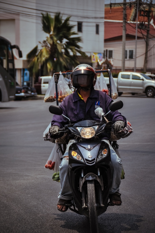 Die Tour macht richtig Spaà und in Ayutthaya fÞhlen wir uns wohl. Als wir auf dem Weg zum dritten Tempel sind, lÃĪcheln wir mit einheimischen Auto- und Rollerfahrern um die Wette und bekommen sogar einen Wheelie vorgefÞhrt. Das heiÃt, dass uns ein Roller Þberholt, der plÃķtzlich sein Vorderrad in die Luft reiÃt und nur noch auf seinem Hinterrad an uns vorbei dÞst. Rock und Roll. Ich gebe einem anderen Rollerfahrer, der soeben noch neben dem Poser gefahren ist, ein Zeichen, dass wir nun dasselbe von ihm erwarten. Der Kollege winkt aber ab.
