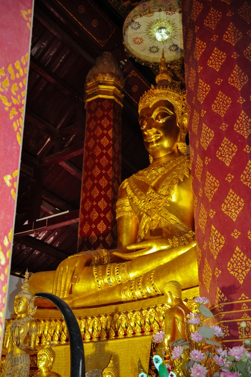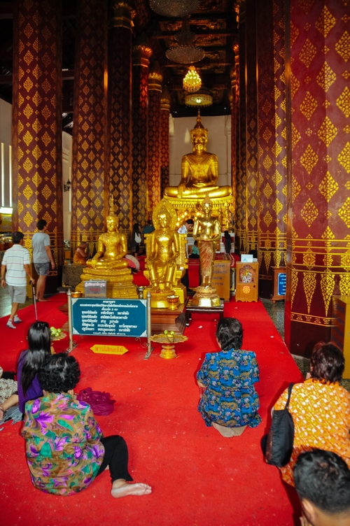 In der Mitte des hÞbschen Tempels prangt ein 80 Meter hoher Chedi, was im Prinzip das Gleiche ist, wie in Angkor ein Prasat, also ein Turmheiligtum. Im Garten des Wat sitzen massenhaft Buddhastatuen nebeneinander, die mit orange-goldenen TÞchern bekleidet sind und weiter vorne gibt es einen etwa zwÃķlf Meter langen, liegenden Buddha zu sehen.