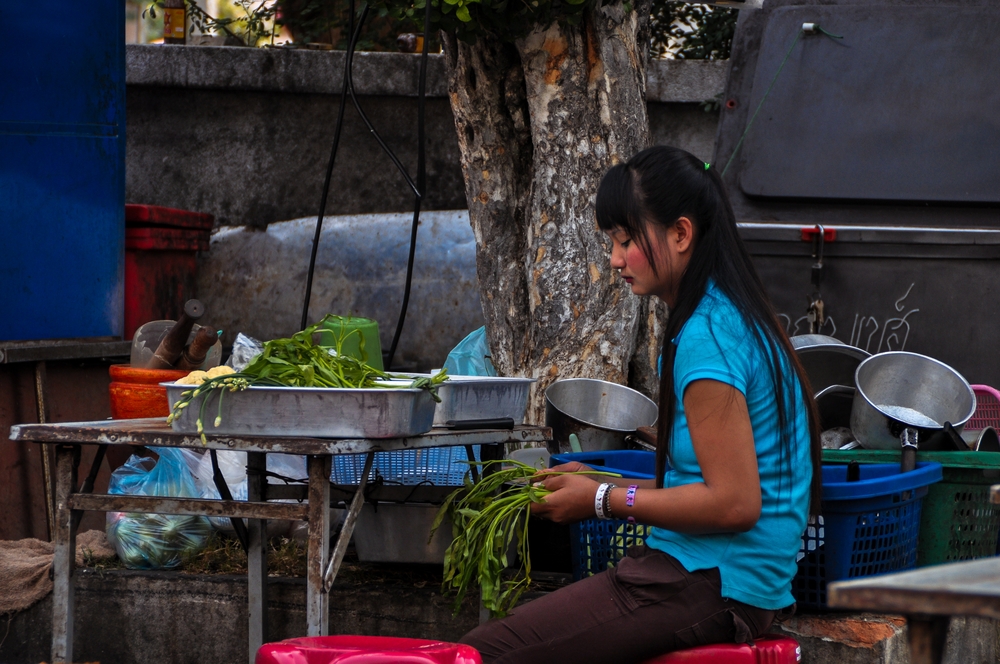 Wir gehen Þber einen Markt, auf dem allerlei Interessantes zu essen angeboten und zubereitet wird. Eine Frau beispielsweise tunkt ihre Hand in einen relativ festen grÞnen Brei und fÃĪhrt in einer Kreisbewegung Þber eine heiÃe Platte. Eine dÞnne Schicht der grÞnen Masse bleibt auf der Platte kleben und erhÃĪrtet sofort: grÞner CrÊpe? AuÃerdem fragen wir uns, wie oft sich die KÃķchin bei dieser Prozedur wohl die HÃĪnde verbrennt.