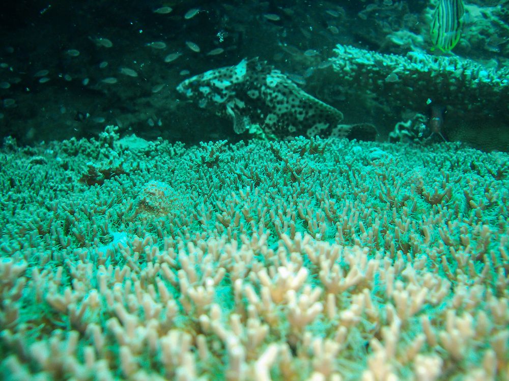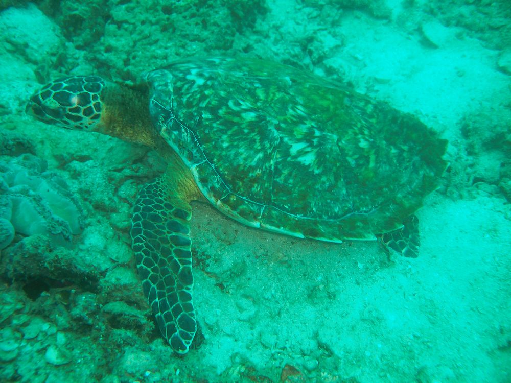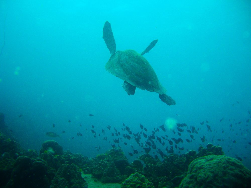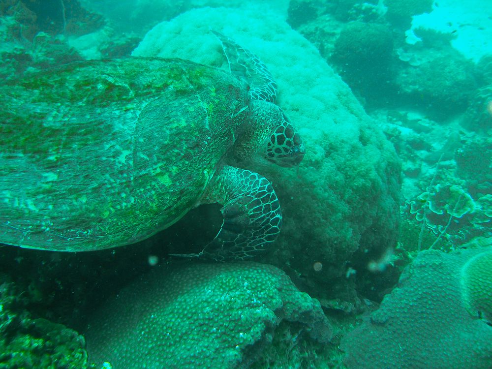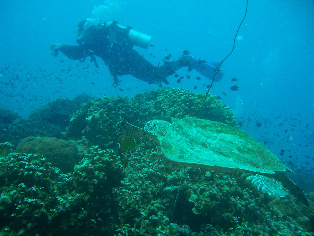 Die Tauchgänge machen allesamt Spaß. Besonders genial verläuft der Tauchgang am White Rock: Nach knapp 25 Minuten nähert sich uns – wie ein zur Landung ansetzendes Flugzeug – eine aus dem Blau des Meeres kommende Schildkröte von gut einem Meter Länge! Das tapsig, aber doch auch irgendwie weise – vermutlich, weil alt – wirkende Tier, steuert direkt auf unsere kleine Gruppe zu, streift haarscharf an unseren Köpfen vorbei und macht sich zum großen Fressen an die Korallen und Anemonen hinter uns ran.