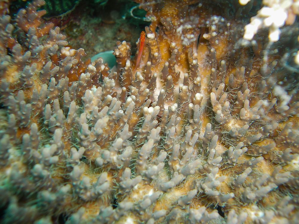 Wir gehen auf knapp 30–35 Meter runter. Die Sicht hier unten ist nicht allzu gut – fünf Meter vielleicht. Eine braune Suppe. Langsam lassen wir das Riff hinter uns und tauchen vorsichtig ins Braune hinaus. Ein Rotfeuerfisch sitzt im Sand. Von den Haien ist noch nichts zu sehen. Wir tauchen tiefer in die gespenstische Atmosphäre hinein. Es fühlt sich schon etwas seltsam an, wenn man, mitten im Ozean, in einer ordentlichen Tiefe, bei schlechter Sicht auf »Haijagd« geht. Man stelle sich nur mal vor: Die Sichtweite beschränkt sich auf fünf Meter und plötzlich kommt aus dem Nichts ein dreieinhalb Meter großer, 200 Kilogramm schwerer Bullenhai auf einen zu! Oder gleich mehrere … Auch möglich wäre, dass wir drei, vier Meter nach oben tauchen, die Sicht sich aufklart und wir von, wer weiß wie vielen Haien umzingelt sind. Ich für meinen Teil bin ziemlich scharf auf diesen Nervenkitzel, der plötzlich zusätzliche Nahrung bekommt: Ein Pilotfisch kommt aus der Suppe auf uns zu! Bepi, der den Tauchgang leitet, dreht sich zu Tomato, meinem schweizer Buddy bei sämtlichen Tauchgängen auf Koh Tao, Jan, dem Mann, der sich weder in den Anzug pisst, noch im Flugzeug scheißen geht, und mir um und gibt uns das Zeichen für »Hai«. Daraufhin dreht er sich wieder nach vorne und schaut suchend um sich. Tomato, Jan und ich tun es ihm gleich. Wenig später ist es dann soweit … Bepi dreht ab und wir tauchen zurück zum Riff. Keine Haie. Hmpf. Zwar haben sich die Haie, auf die ich mich so gefreut habe, nicht blicken lassen, aber trotzdem ist der Tauchgang sehr schön. In der Mitte des Tauchgangs wird Jan auf einmal hektisch, macht laute Geräusche und zeigt wild in meine Richtung. Ich gehe davon aus, dass er etwas Interessantes hinter mir entdeckt hat und drehe mich um. Ich kann aber nichts entdecken, woraufhin ich mich wieder zu Jan drehe, um ihm deutlich zu machen, dass ich keine Ahnung habe, wovon er da blubbert.