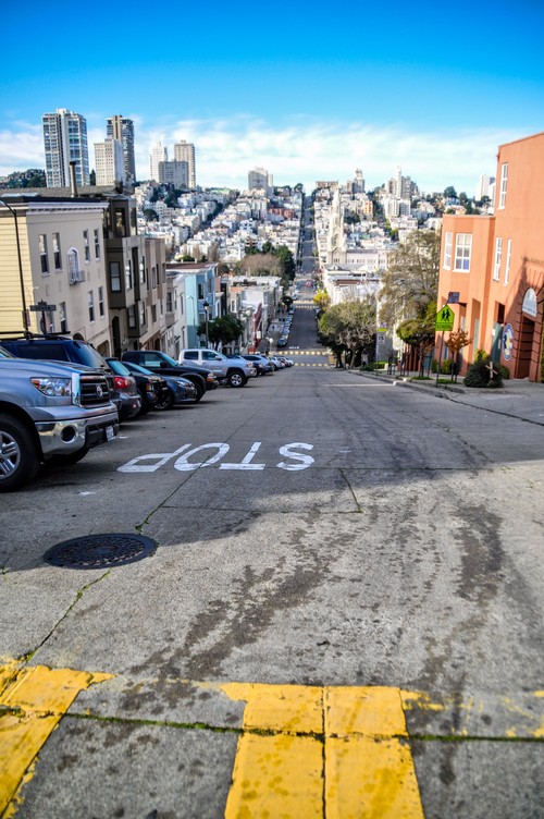Es gibt noch eine weitere steile Treppe auf der Ostseite des Hügels. Es sind die Treppen der Filbert Street, die sich einen Block südlich der von mir erklommenen Stufen befinden. Auch diese Treppen lasse ich hinter mir und nehme stattdessen ein paar Stufen, die mich auf der südwestlichen Seite des Hügels zur Ecke Filbert und Kearny Street führen. Hier treffen die beiden Straßen aufeinander und werden, nachdem der Telegraph Hill sie unterbrochen hatte, wieder fortgesetzt. Gen Westen verläuft die Filbert Street zunächst steil nach unten, bevor sie sich wieder in die Höhe erstreckt und sich zwischen der Hyde und der Leavenworth Street mit einer Steigung von 31,5 %, das sind 17.5°, zu einer der steilsten befahrbaren Straßen der westlichen Hemisphäre auftürmt.